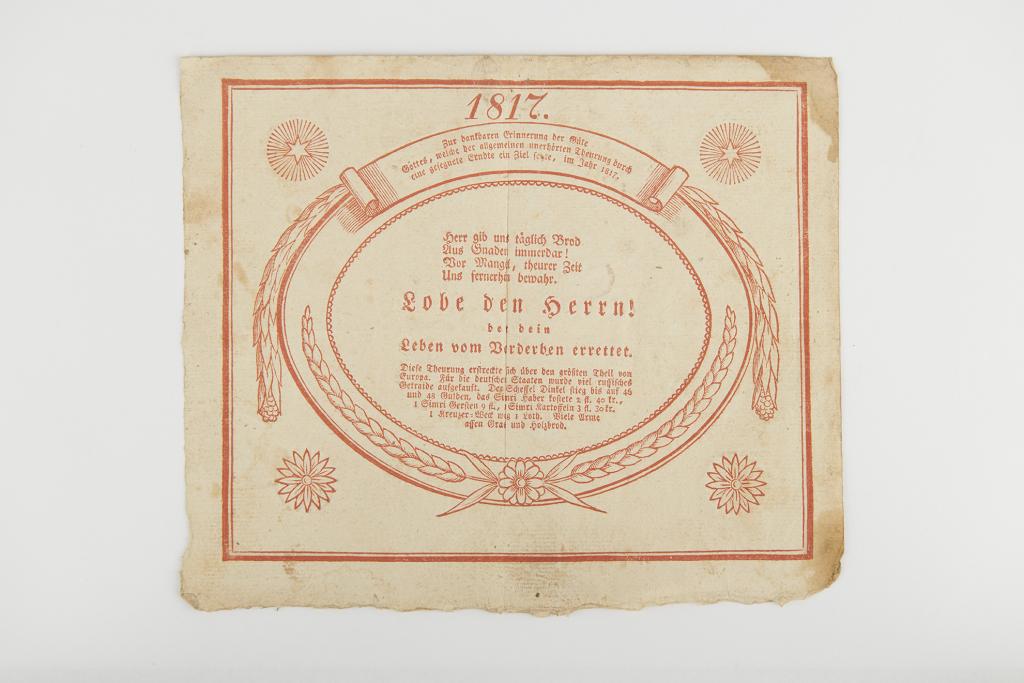 Holzschnitt zur Erinnerung an die Hungersnot, die nach dem „Jahr ohne Sommer“ 1817 auch in Süddeutschland ausbrach.
